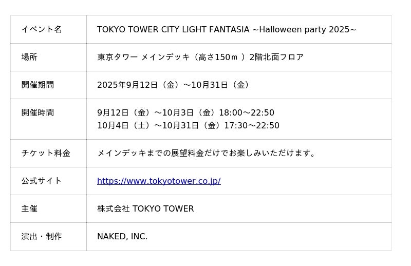 株式会社ネイキッド(英語表記:NAKED, INC. 、所在地:東京都渋谷区、代表:村松亮太郎)は、東京タワーメインデッキ(150m)2階北面フロアにて、2025年9月12日(金)~10月31日(金)の期間開催されるプロジェクションマッピングショー『TOKYO TOWER CITY LIGHT FANTASIA ~Halloween party 2025~』の演出・制作を手がけています。