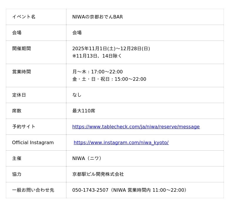株式会社ネイキッド(本社:東京都渋谷区、代表:村松亮太郎)がプロデュースするアートテラスラウンジ『NIWA(ニワ)』は、京都駅ビル東広場にて冬季限定イベント『NIWAの京都おでんBAR』を2025年11月1日(土)~12月28日(日)まで開催いたします。京都駅直結の開放的なテラスで、京おでんと地酒の熱燗を味わいながら、京都ならではの“あたたかい夜時間”をお楽しみいただけます。