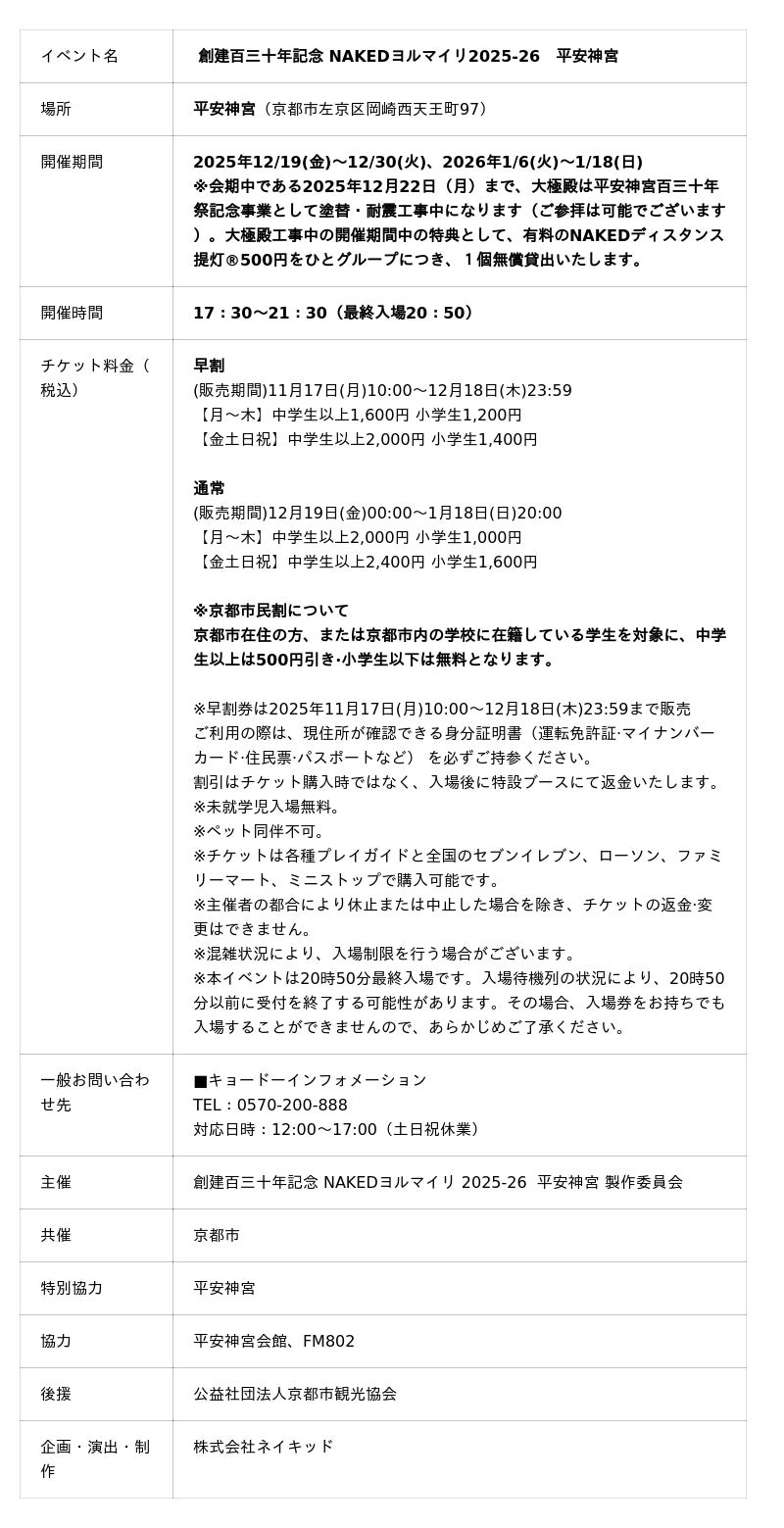 株式会社ネイキッド(英語表記:NAKED, INC. 、 所在地:東京都渋谷区、代表:村松亮太郎)は、京都の国指定重要文化財である平安神宮(所在地:京都府京都市左京区岡崎西天王町)の創建百三十年を記念して、2025年12月19日(金)~12月30日(火)、2026年1月6日(火)~1月18日(日)の期間、夜間参拝イベント『創建百三十年記念 NAKEDヨルマイリ2025-26 平安神宮』を開催いたします。