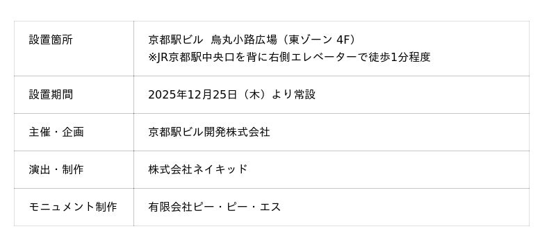 株式会社ネイキッド(本社:東京都渋谷区、代表:村松亮太郎)は、2025年12月25日より、京都の玄関口・京都駅ビル(京都駅ビル開発株式会社(京都市下京区、代表取締役社長 :橋本修男)に常設された「KYOTOモニュメント」を手掛けましたことをご報告いたします。