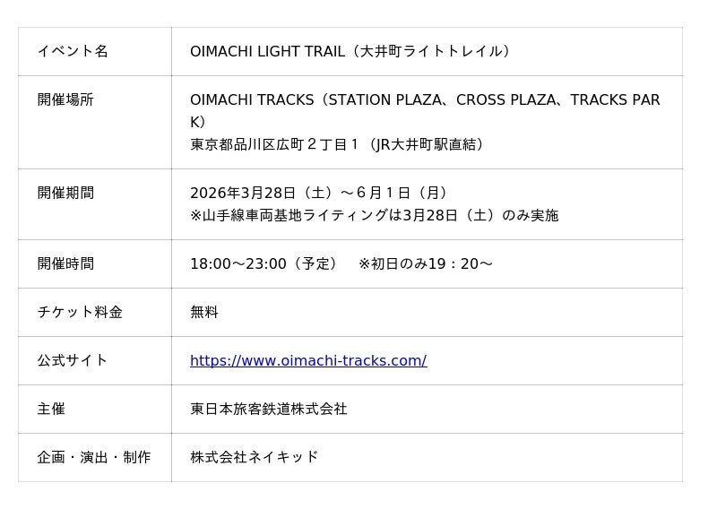 株式会社ネイキッド(英語表記:NAKED, INC. 所在地:東京都渋谷区、代表:村松亮太郎)は、東日本旅客鉄道株式会社(JR東日本)が展開する広域品川圏の共創まちづくりの一環として、2026年3月28日にまちびらきする大井町駅直結の大規模複合施設「OIMACHI TRACKS」のプロジェクションマッピング&ライティングイベント「OIMACHI LIGHT TRAIL」を演出・制作いたします 。