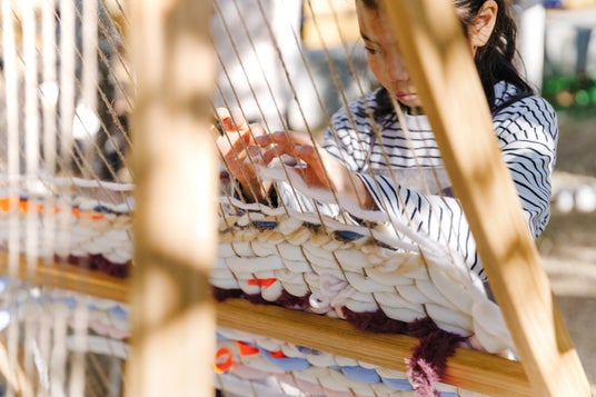 子どもの背丈より大きな織り機を囲み、みんなで一つの大きな布を織り上げる共創のアトリエです。縦糸の間に、まちの布やリボンなど、さまざまな素材の端材を自由に織り込んでいきます。参加者全員のぬくもりが重なっていく、まちの記録を紡ぎましょう。
