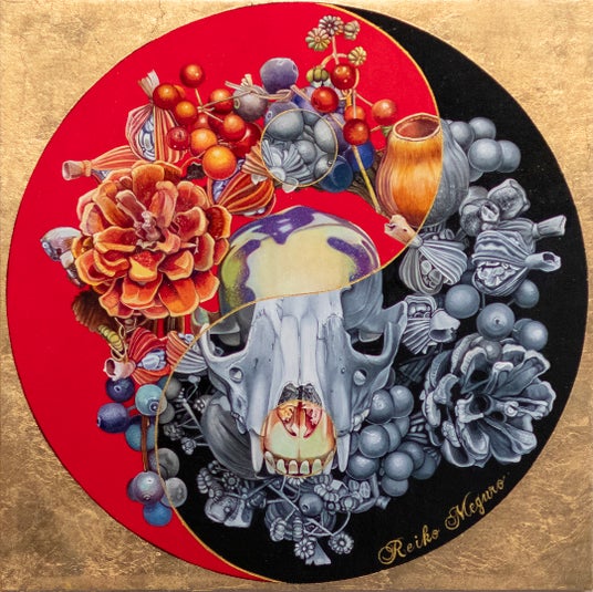 死生観をテーマにした画家・目黒礼子の6度目の個展「Yin Yang=陰陽」では、生と死、此岸と彼岸といった相反しながらも切り離せないつながりを、目黒礼子が禍々しくも美しく、そして温かみをもって描き出します。彼女のこれまでのメインモティーフは「骸骨」ですが、一般的に抱かれがちな不気味さや怖さを感じさせません。本展では、どこか満足気に微笑むような骸骨シリーズをはじめ、陰陽シリーズ、昆虫、花、果実などの作品に加え、『ツミデミック』の装丁作品、「大菊2021」も展示いたします。ぜひ実物の作品をご高覧ください。