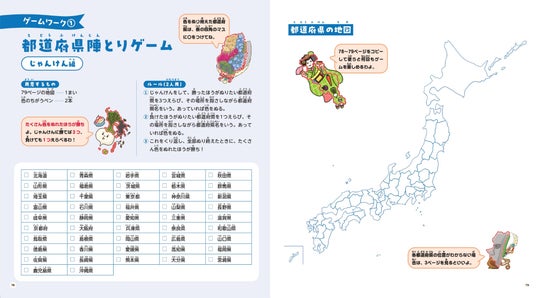 「都道府県のカタチはキャラクターのどこに隠れている?」という都道府県のカタチ探しや、「ここどこ?ワーク」「都道府県陣とりゲーム」「都道府県シルエットクイズ」などのワークで、学んだ内容をゲーム感覚で楽しくアウトプットすることができます。友人同士や親子で盛り上がること間違いなし!覚えることを重視されがちな社会科の学びが能動的な学びへと変わっていくサポートをします。