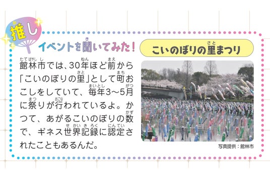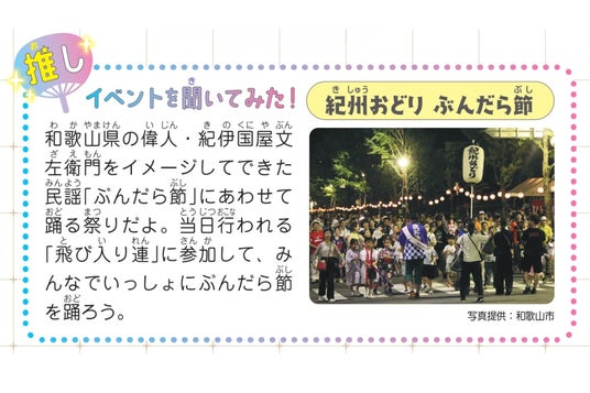 全国の小学生に向けて、「ぜひ知ってもらいたい行事やイベント」を紹介。地域の人々にアンケート取材を実施し、隠れた面白イベントや行事をその由来とともに紹介していきます。イベント・行事をきっかけに、その地域の文化や歴史に興味を持てるようになります。