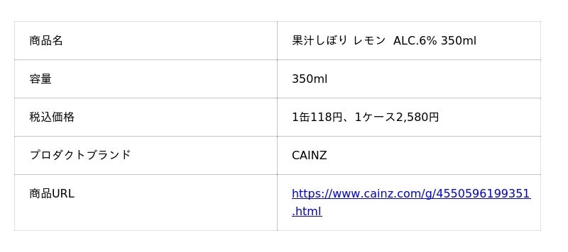 ・果汁しぼり レモン ALC.6% 350mlレモン果汁を12%使用し、果実そのものの爽やかな酸味とほのかな苦みを楽しめる缶チューハイです。香料・酸味料・甘味料を使わず、果実とお酒だけで仕上げました。甘さを抑えた味わいで、食事と合わせやすい一杯です。