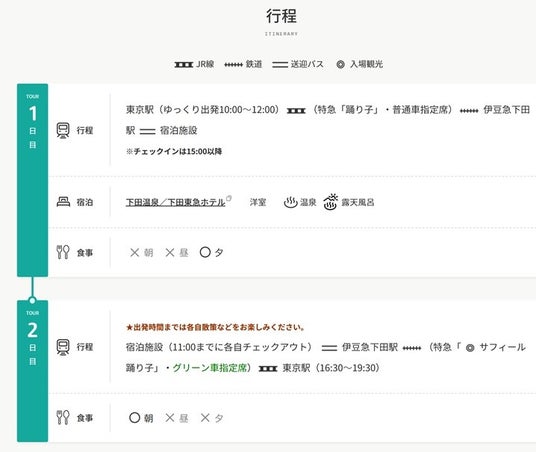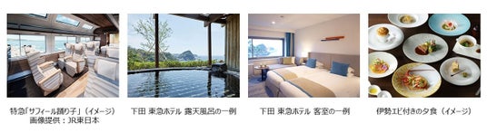 自然や文化・歴史などの魅力あふれる伊豆。首都圏からのアクセスもよく・家族や友人と気軽に行ける日本でも有数の観光地です。宿泊は、高台に建ち、眼下に大浦湾を一望するリゾートホテル「下田 東急ホテル」の高層階のお部屋。伊勢エビ付きの夕食をご用意いたします。お帰りは、移りゆく車窓を眺めながら・移動中も優雅な時間をお過ごしいただける「サフィール踊り子」。天窓からの陽の光がガラス製の荷棚を通して車内に降り注ぐ心地よい空間から、本物の伊豆をお楽しみください。