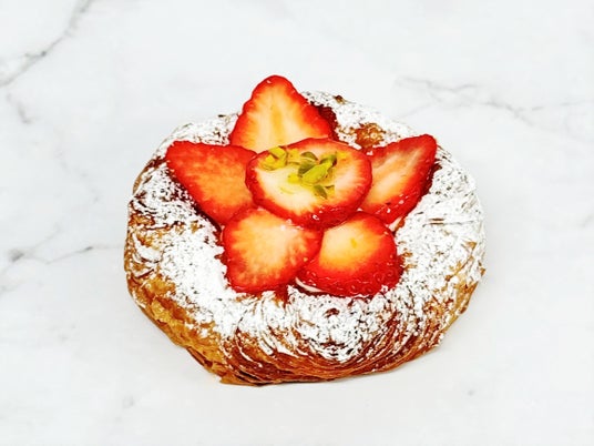 サクサクのクロワッサン生地の上に、自家製カスタードを絞り、埼玉県産高級いちご「あまりん」をトッピングしました。甘酸っぱいいちごの風味と、クロワッサン生地・やさしいカスタードクリームの風味がベストマッチ。※数量限定: 1日10個