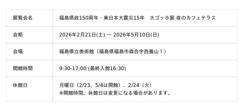 2026年2月21日~5月10日に福島県立美術館(福島市)で開催する「福島県政150周年・東日本大震災15年 大ゴッホ展 夜のカフェテラス」について、「前売券」及び「福島展限定グッズ付きチケット」の販売を開始しました。