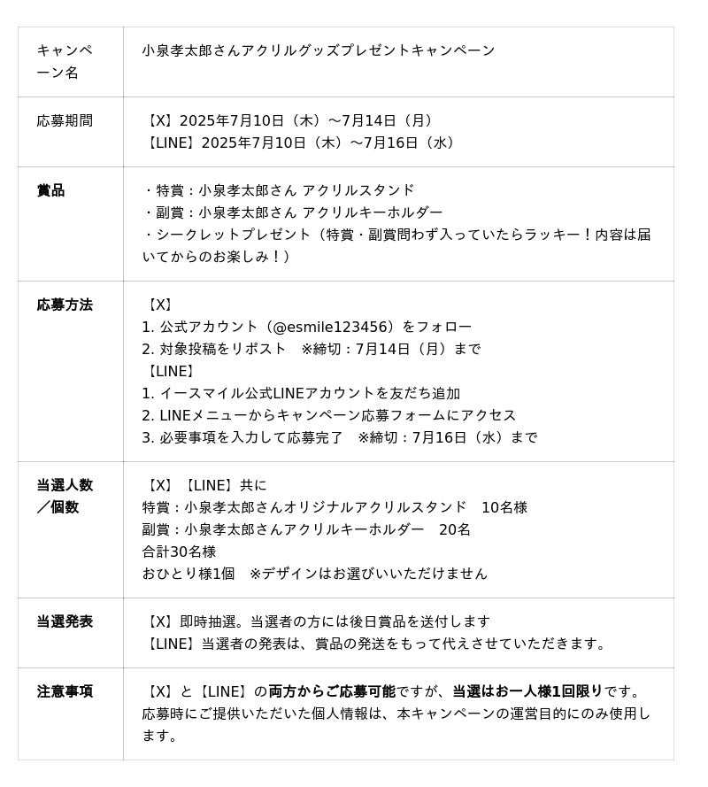 本キャンペーンでは、公式Xアカウントのフォロー&リポスト、またはLINE公式アカウントからの応募で、それぞれ抽選で合計30名様に小泉孝太郎さんオリジナルアクリルグッズをプレゼントいたします。どちらからでもご応募いただけますので、ぜひご参加ください!