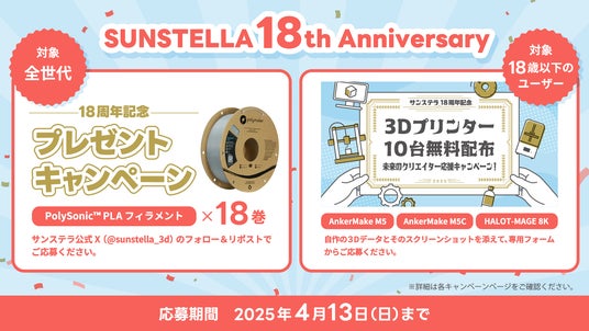 株式会社サンステラは創業18周年を記念した企画で18歳以下のクリエイターに合計10台3Dプリンターを無料配布。また、全年代向けにフィラメントを計18名にプレゼントするSNSキャンペーンも実施します。