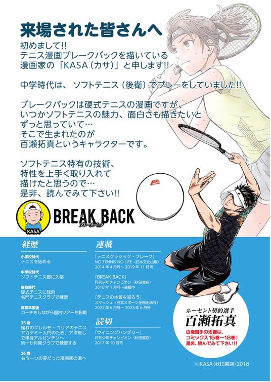 ソフトテニスファンの方から「ソフトテニスの大会で硬式テニスの漫画なの?」と質問される方も多くいました。『BREAK BACK』は硬式テニスの漫画ですが、同作品に登場する百瀬拓真(ももせ・たくま)というキャラクターは、元ソフトテニスのジュニアチャンピオンで、硬式テニスよりソフトテニスの方がすごい事を証明するために高校入学と同時に硬式テニスに転向したキャラクターです。パネル展示では漫画カットを使って、ソフトテニス・硬式テニスで共通して通じるテクニックや、元ソフトテニス選手が硬式テニスでは苦手な事、などについて解説する記事を掲載しました。人物紹介や、記事を読んだソフトテニスファンのお客様は、「それは面白そう!読んでみたい!」と、作品に興味を感じた方が多くいらっしゃいました。
