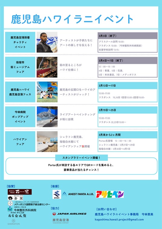 本イベントは、鹿児島空港を舞台に、ハワイアンアートや飲食、物販を通じて、鹿児島とハワイの文化交流を促進するイベントです。Tehrell Porter氏によるライブアートパフォーマンスも実施し、来場者に鹿児島の新たな魅力を発見していただく機会を提供します。