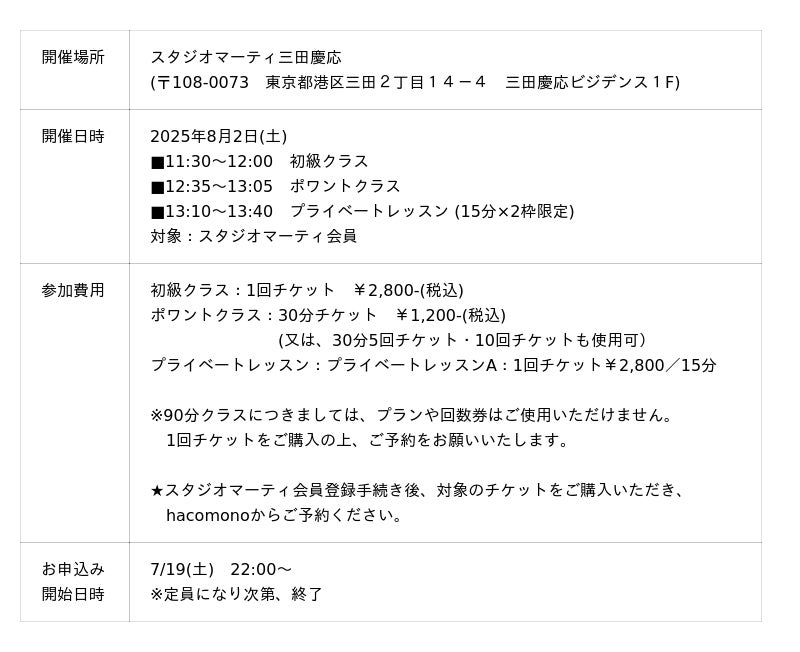 - 参加申込方法:スタジオマーティ会員登録後、予約サイト「hacomono」にて対象チケットをご購入の上、お申込みください。