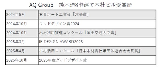 株式会社AQ Group(本社:埼玉県さいたま市西区、代表取締役社長:加藤博昭)が手掛けた、純木造8階建て本社ビル(埼玉県さいたま市西区三橋5丁目976-1)と、純木造4階建てマンション「AQ FOREST 大宮桜木町」(埼玉県さいたま市大宮区桜木町4丁目883-1)が10月15日、公益社団法人日本デザイン振興会主催の「2025年度グッドデザイン賞」(オフィス・産業施設の建築・環境部門)・(小規模集合住宅部門)でグッドデザイン賞を受賞しました。いずれも、日本古来の在来軸組工法をベースにした“普及型”モデルで、CO2削減や森林循環を促すなど、社会的意義のある取り組みとして高く評価されました。