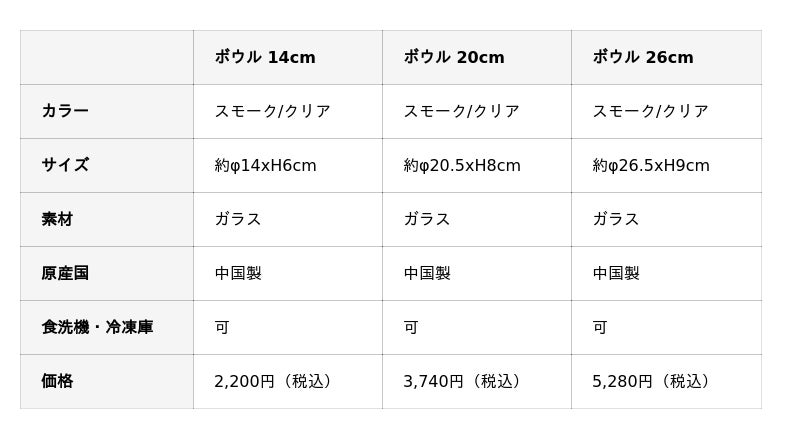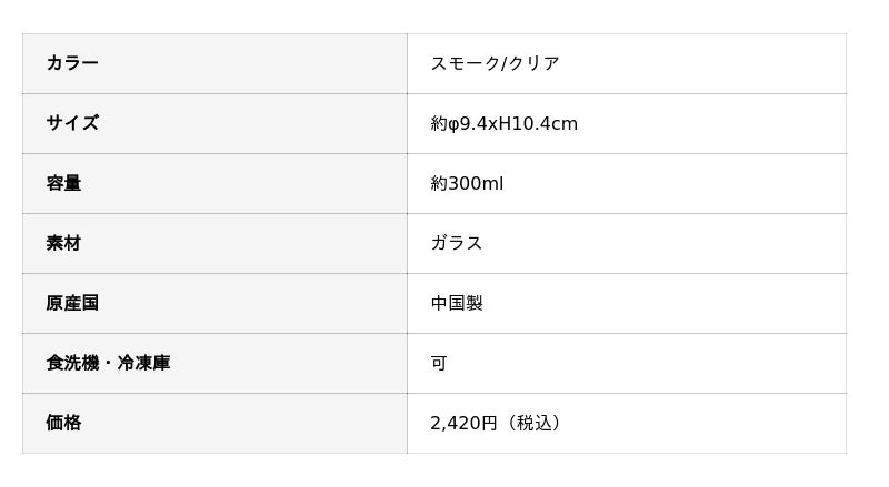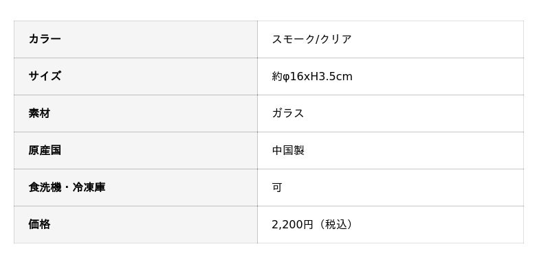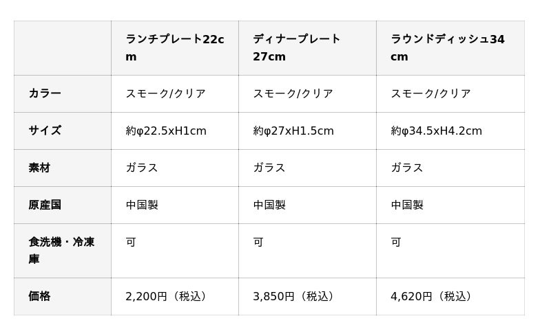 ラインナップは、グラス、プレート、ボウルなど豊富に揃い、シーンや用途に合わせてお選びいただけます。カラーはスモークとクリアの2色展開。食洗機や冷凍庫にも対応しており、デザイン性と実用性を兼ね備えたテーブルウェアです。