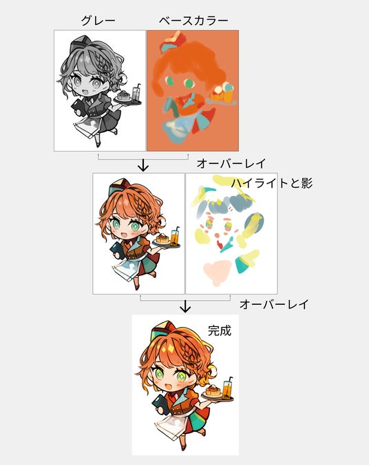 オーバーレイで簡単に色が入れられる。基本は、ベースカラー/ハイライト/影/彩度の要素を各レイヤーで載せるだけ