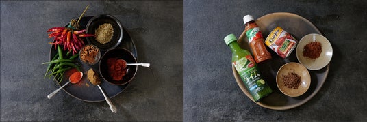 赤唐辛子、ドライオレガノ、シナモンスティック、クミンパウダー、タヒンなど