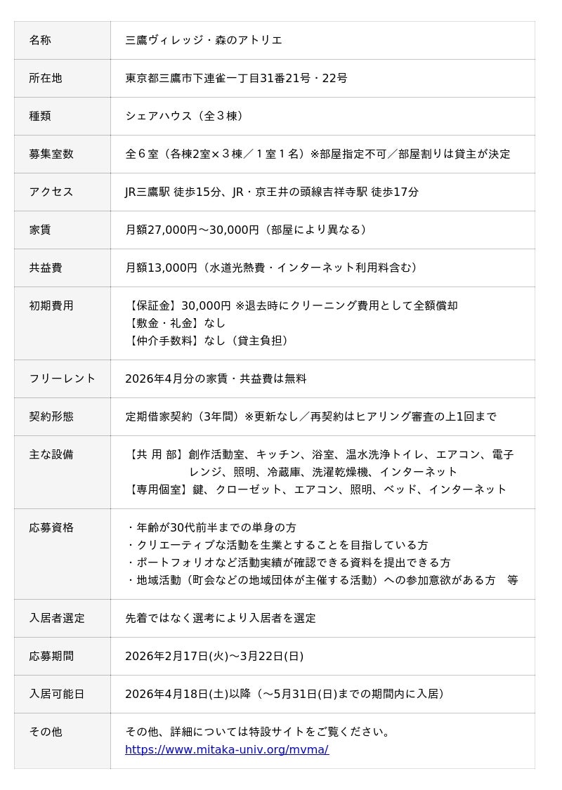 若手クリエーター限定・制作スペース付シェアハウス「三鷹ヴィレッジ・森のアトリエ」第一期メンバー(入居者)募集を開始(2026年4月入居)