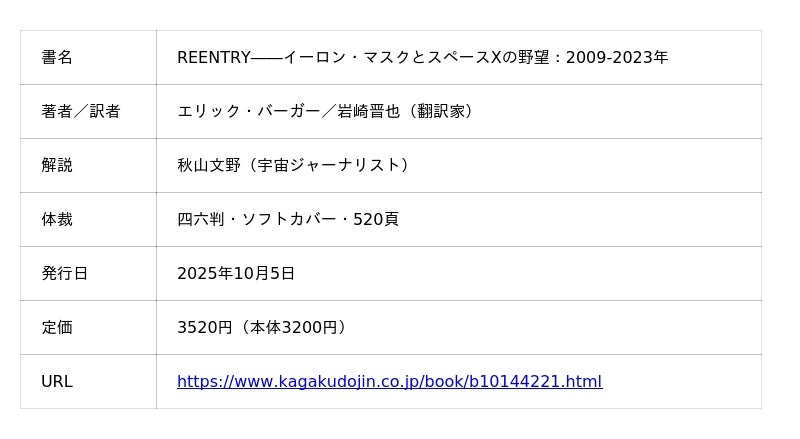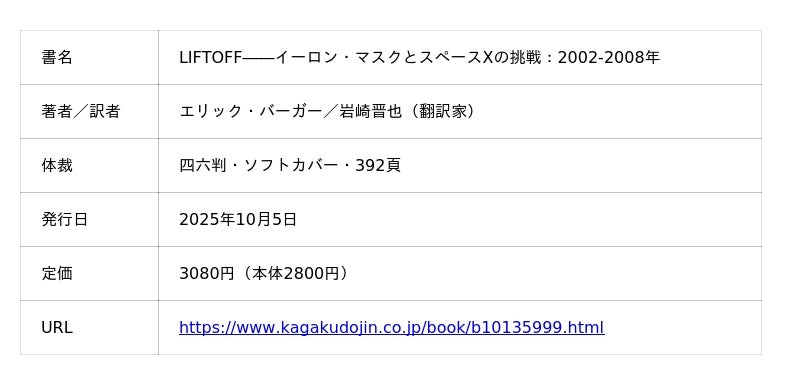 株式会社化学同人(本社:京都市下京区、代表取締役社長:曽根 良介)では、イーロン・マスク率いる米国の宇宙企業スペースXの創業以来の軌跡をたどった『LIFTOFF(リフトオフ)』『REENTRY(リエントリー)』の2冊を、10月5日に同時刊行します。