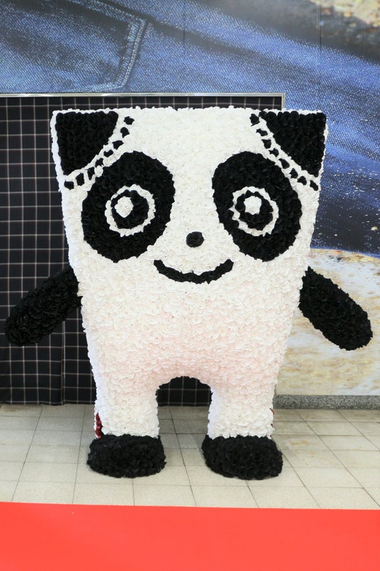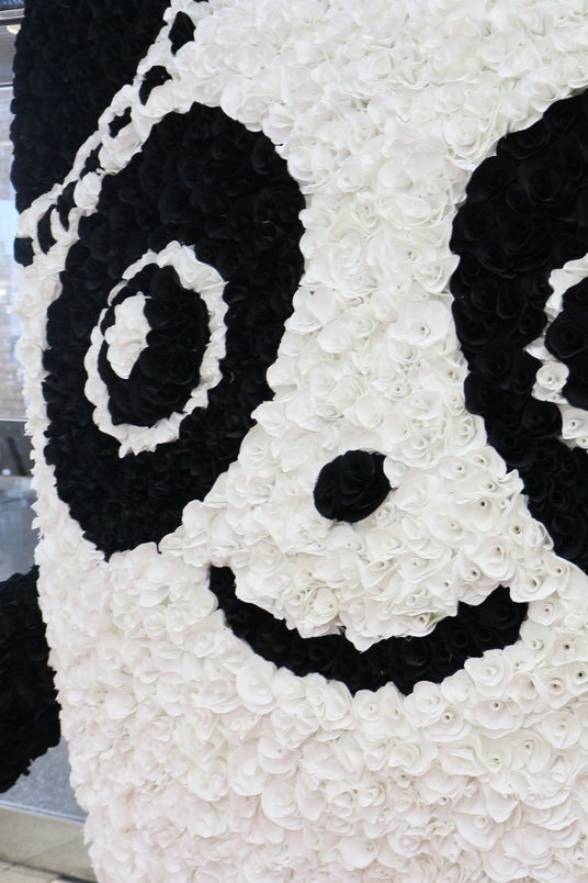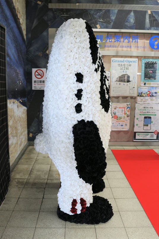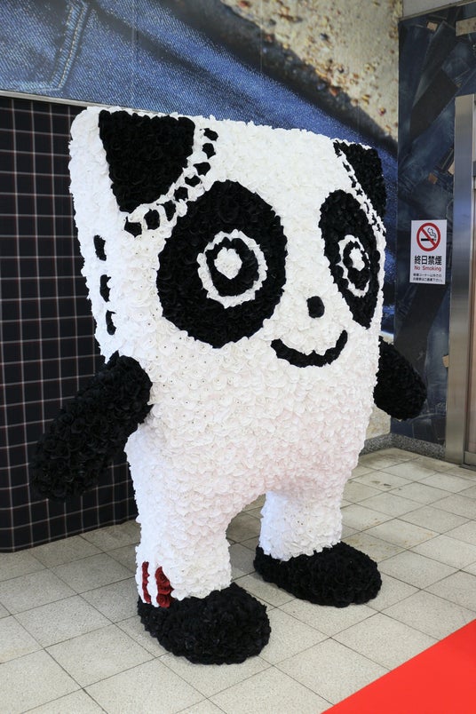 児島アートプロジェクト<第一弾>制服の余り生地をアップサイクルしてつくるSDGsエコフラワー約1万本でできた「Gパンだ」像がJR児島駅にお目見え!