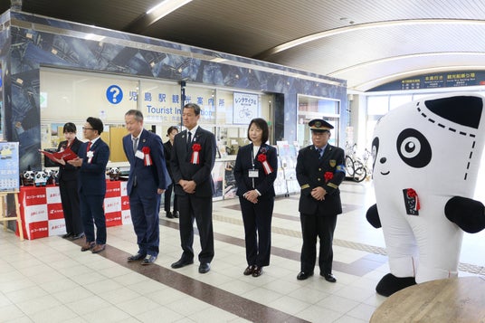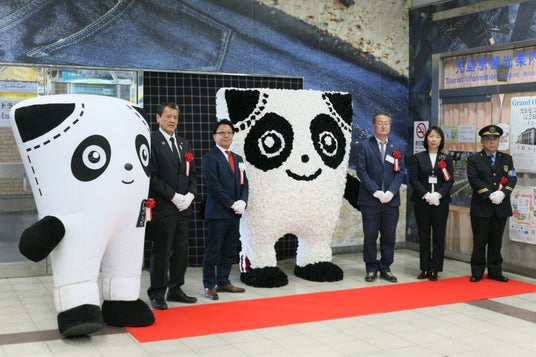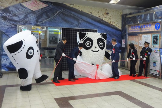 菅公学生服株式会社 (本社:岡山市北区駅元町 代表取締役社長:尾崎 茂 以下:カンコー学生服)は、2025年3月27日(木)に、JR児島駅において、児島アートプロジェクト<第一弾>制服の余り生地をアップサイクルしてつくるエコフラワーでできた「Gパンだ」像の除幕式を開催しました。