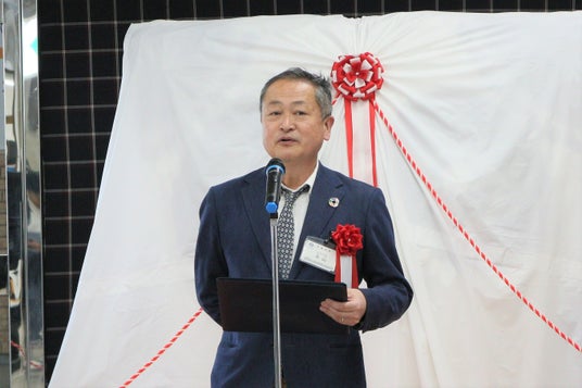 本日は多くの皆様にお集まりいただき、誠にありがとうございます。制服の余り生地を利用して全国の子どもたちにエコフラワーを作っていただき、その花を束ねてこの巨大なGパンだを制作することができました。今年は大阪・関西万博や瀬戸内国際芸術祭などがあります。その中で、観光面でも地元の児島を元気づける一助になれればという思いでこのプロジェクトを実施しました。この取り組みは倉敷市と児島商工会議所の皆様のご協力のもと実現しております。また、児島駅に当面展示していただけるとのことで、JR西日本様のご協力にも深く感謝申し上げます。児島を彩る一つの風物詩として、皆様に楽しんでいただければ幸いです。