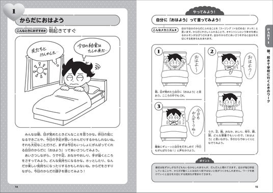 ベッドの上で寝転びながら、朝ごはんを食べながらなど、子どもがひとりで手軽にできるものから、授業前・授業中にクラス全体でできるものまで39のワークご紹介しています。