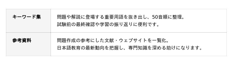 「読解問題」では、日本語教育の最新の動向や、実際に現場で目にする指導記録や教師同士のやりとりなどが、読解文になっています。問題を解くだけでなく、読解文自体を繰り返し読み直すことで、読解力とともに専門的な知識も深まるようにしています。■ 巻末資料で整理&復習!