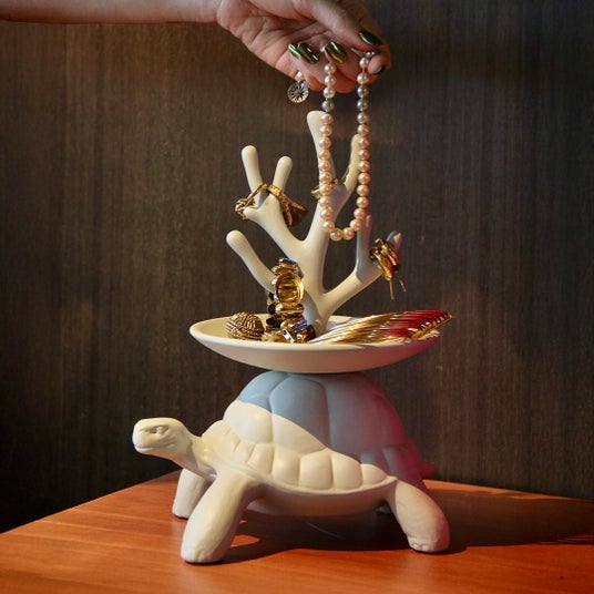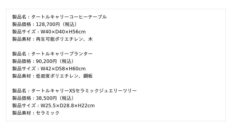 タートルキャリーコレクションは、カメ型の多用途インテリアシリーズです。カメの甲羅を台座として、ブックケース、コーヒーテーブル、プフ、プランター兼シャンパンクーラー、ベッドサイドテーブル、XSシリーズ3種の計8アイテムを展開します。大型モデルはリサイクル可能なポリエチレン製、XSシリーズはセラミック製です。自然界の生き物に宿るユーモアと機能を共存させる、マルカントニオならではのアプローチが全アイテムに貫かれています。