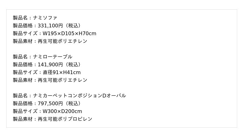 日本語の「波」が由来の本コレクションは、水面の波紋や巣を思わせる有機的なフォルムが特徴のアウトドアシリーズです。アームチェアからカーペットまで、空間をトータルに彩る5つのアイテムを展開。ソファ、アームチェアには排水構造を内蔵し、屋外での利便性を追求しています。素材には、環境に配慮した『再生可能ポリエチレン』を採用。原料に色を練り込む『バッチ・カラー』手法を用い、屋外使用でも色あせしにくい工夫を施しています。カラーは、洗練された単色3種に加え、アップサイクル素材による「ミックス」3種の計6色を展開しています。