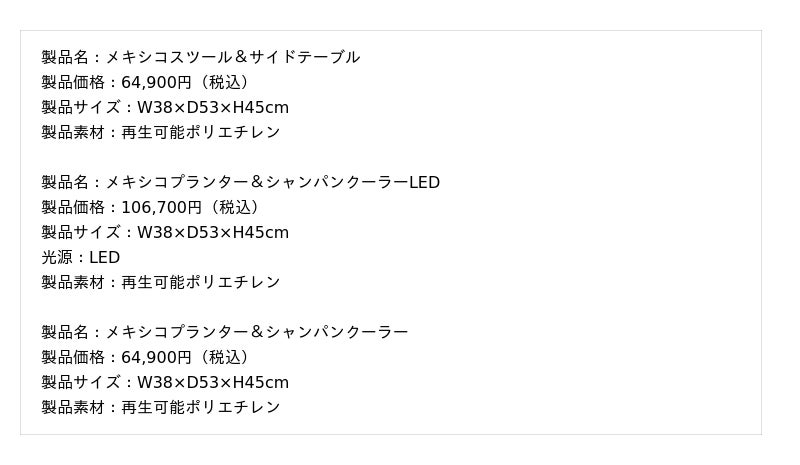 メキシコの「カラベラ(彩色ドクロ)」をモチーフとしたプロダクト。2017年のミラノデザインウィークで発表され、命の循環を祝うメキシコの祝祭文化をインテリアとして表現した意欲的なシリーズです。スツール&サイドテーブルとプランター&シャンパンクーラーで使用可能な多用途設計が特徴です。仕上げはポリエチレン版・ベルベットフィニッシュ版・充電式LEDランプ版のバリエーションを展開します。共通サイズは幅38 × 奥行53 × 高さ45cm。ランプ版は16色のRGB切り替えとリモコンに対応しています。
