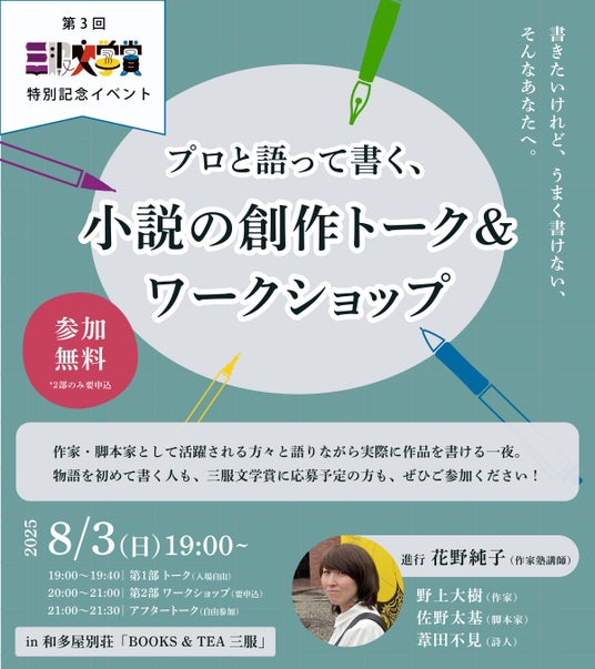 自身が主宰する作家塾でプロ作家を多数輩出してきた花野純子さんを進行役に、作家・野上大樹さん、脚本家・佐野太基さん、第2回三服文学賞 受賞者・葦田不見さんをお招きして、「書くこと」を語るトークと、実際に短い作品を書いてみる創作ワークショップを行います。第二回受賞作家らの創作トークと、参加者による実際の執筆・共有を通して、“書く愉しみ”を深める一夜をお届けします。