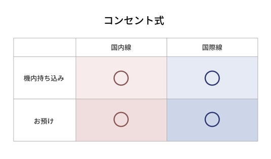 プラグをコンセントに差して使用するコンセント式は個数制限なしで機内への持ち込みも、預け入れも可能。ただし、海外の場合は電圧、コンセントの種類が異なるため、海外対応タイプもしくは変圧器・プラグアダプターを併用してください。
