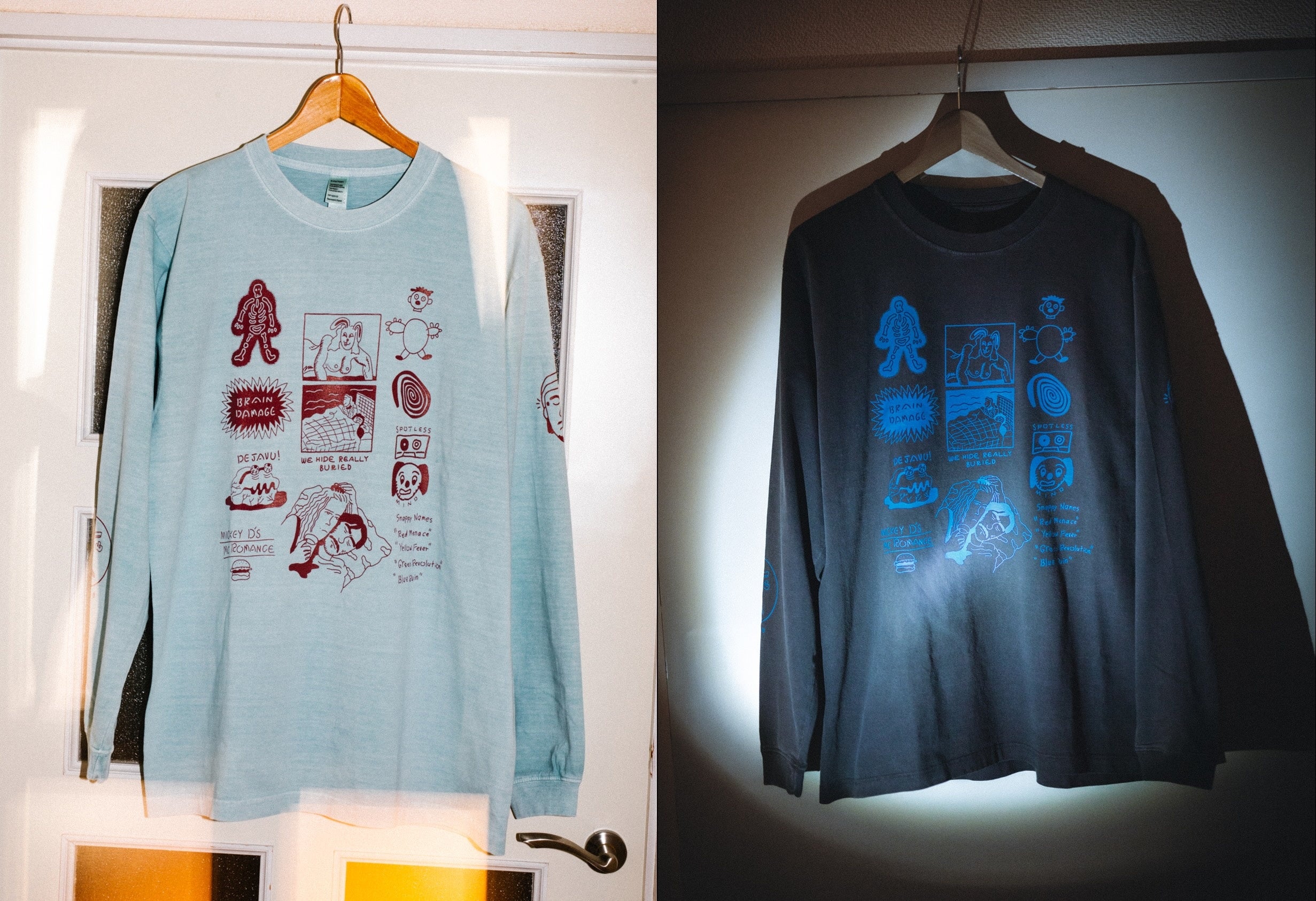 フロントには『エターナル・サンシャイン』の様々なシーンをモチーフとしたイラストを大胆に配置、バック、両スリーブにもワイポイントのイラストをあしらった贅沢な一枚。ボディは味のあるヴィンテージ風、太リブ&ワイドシルエットが魅力のD-FACTORYヘビーウェイトを使用。