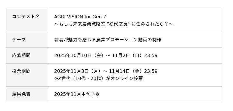 若者と農業の距離が遠いという課題に対し、「大人が若者に伝える」のではなく、「Z世代がZ世代を巻き込む」というコンセプトのもと、本企画は生まれました。選ばれたアンバサダーには、SNSでのコンテスト情報発信、作品応募の呼びかけ、投票参加の促進など、若者目線でコンテストを盛り上げる役割を担っていただきます。
