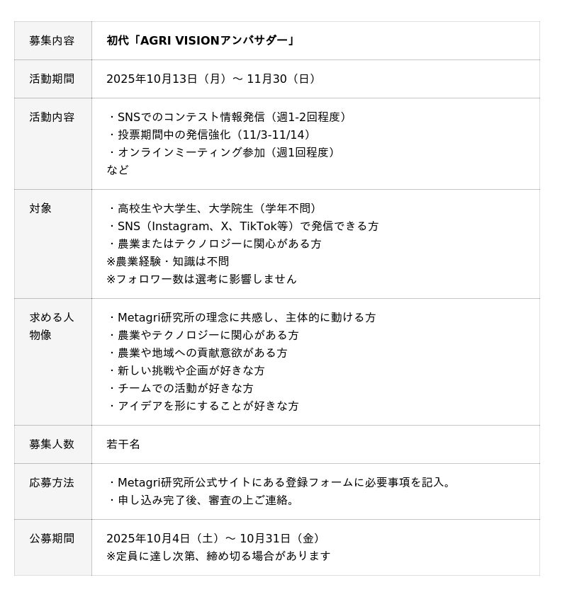 農業×新技術を推進する「Metagri研究所(運営:株式会社農情人)」は、第2回動画生成AIコンテスト『AGRI VISION for Gen Z』の開催に伴い、コンテストを盛り上げるZ世代のエバンジェリストとして、初代『AGRI VISIONアンバサダー』を公募いたします。