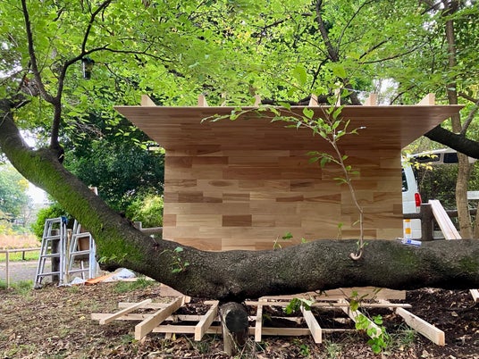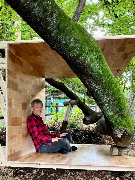 本作品は、来場者が内部に入り、光や風、木々を身体で感じながら、自然との一体感と風通しの良さを体感できるインスタレーションです。空間全体を通して、自然の中で呼吸するような心地よさを感じられる構成としました。制作には、西南桜やカバ、オークの無垢材を使用し、てまひま不動産でリノベーション工事の際に発生する余剰資材や廃材も積極的に活用。「重力に抗う」というテーマは、桜やクヌギの木の自然な姿から着想し、水平に伸びる桜の幹と垂直に伸びる木々の対比を空間に取り入れました。