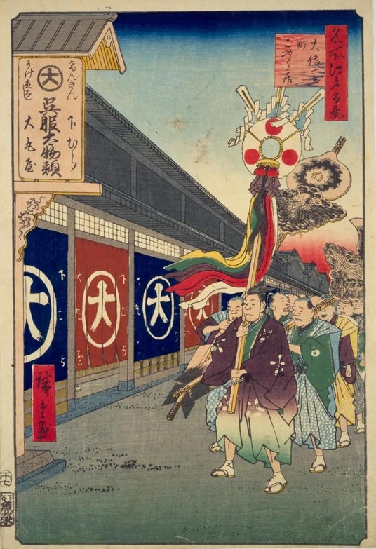参考:広重『名所江戸百景 大伝馬町こふく店』,魚栄,安政5. 国立国会図書館デジタルコレクション https://dl.ndl.go.jp/pid/1312310 (参照 2025-06-17)
