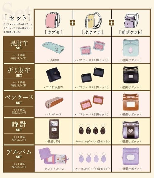 ランドセルのカブセ(フタの部分)、大マチ(側面部分)、前ポケットからそれぞれお気に入りを選べる長財布セット、折り財布セット、ペンケースセット、時計セット、アルバムセット、5つのお得なセットをご用意いたしております。