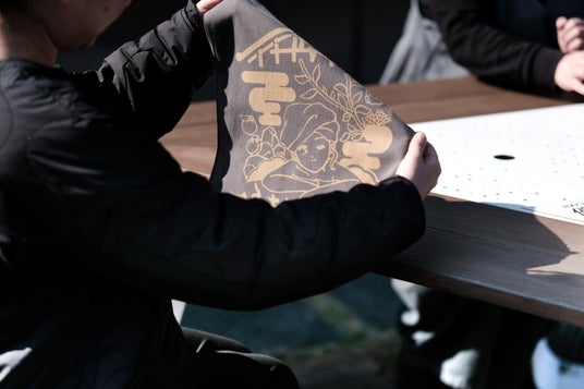 お茶染めについて静岡の基幹産業であるお茶。その製造工程で捨てられてしまう部分の茶葉を染料として使用。染め上がる作品は、渋みのあるチャコールグレーに仕上がります。使用した茶殻は、堆肥へと加工し、畑へ循環していく、静岡ならではのサステナブルな体験です。本体験では、染め上がった布地を「抜染」という技法で色を抜くことで、鮮やかな黄金の柄を描きます。
