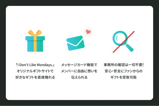 この度のギフトサイト「I Don't Like Mondays. GIFT」の公開により、I Don’t Like Mondays.のメンバーに、ファンが気軽に安全にギフトを贈ることが可能になります。