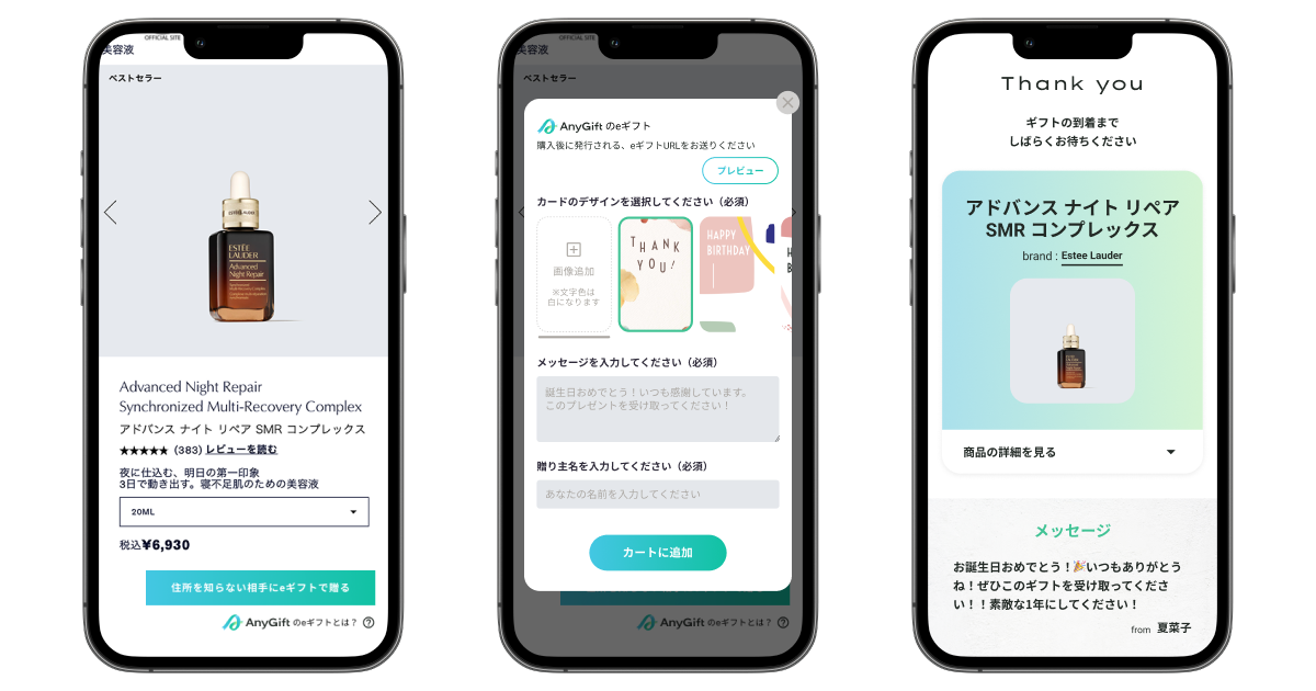 今回のAnyGiftの提供により、「エスティ ローダー公式オンライン ショップ」にてeギフトが贈れるようになります。