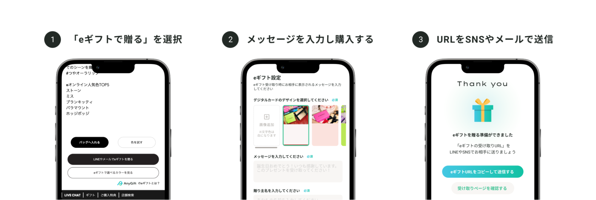 AnyGiftは、相手の住所を知らなくてもLINEやメールで贈ることができる"eギフト機能”を、ECサイトに組み込むことができるサービスです。