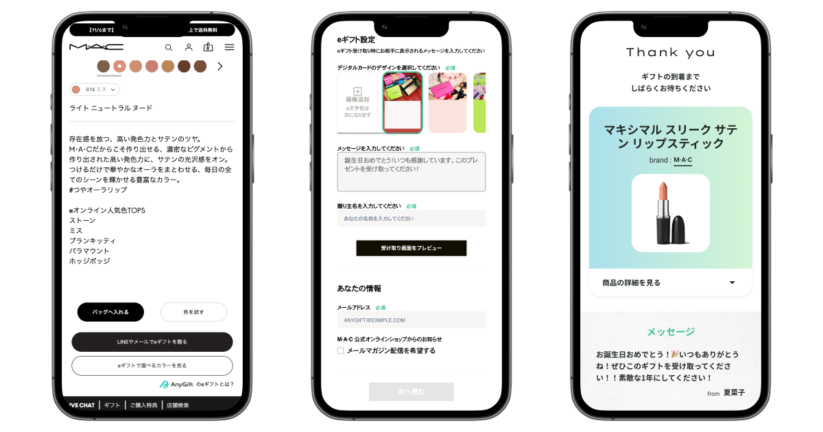 AnyReach株式会社(本社:東京都港区、代表取締役:中島 功之祐)は、ELCジャパン合同会社(本社所在地:東京都千代田区、職務執行者社長:ジェームズ アクィリナ)が展開する「M・A・C公式オンラインショップ」にギフトサービス『AnyGift(エニーギフト)』の提供を開始しました。