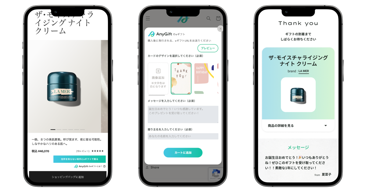 このような背景から、eギフトサービス「AnyGift」をラ・メール公式オンラインショップに導入いただくこととなりました。住所を知らなくても贈ることができるeギフトサービスを活用することで、より気軽に「ラ・メール」の製品をギフトとして利用できる環境が整いました。今回の取り組みにより、「大切な人へ、特別な体験を届けたい」というお客様の思いを実現しつつ、さらに多くの方々に製品が届く機会が広がることが期待されます。
