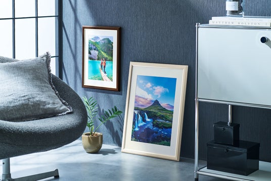 フレームは樹脂製、表面材にUVカット仕様のアクリルを採用した軽量設計。表面材のUVカットアクリルは、紫外線による額縁内部の写真等の経年退色を抑制します。また、アクリルはガラスに比べ約半分の軽さながら同等の衝撃強度と高い透明性を兼ね備えています。