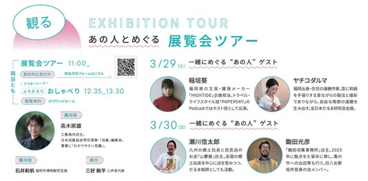「民藝MINGEI」「民具と生活」の2つの展覧会を、独自の視点で楽しむ福岡の“あの人”たちを日替わりでゲストにお迎えし、参加者とみんなで一緒に会場を巡る「展覧会ツアー」を行います(ツアー参加者の各展入場料金は有料)。