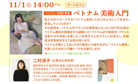 私たちがイメージする「ベトナム美術」とはどのようにして生まれ、普及していったのか? その源流を、ベトナムがフランスの植民地となった1887年以降のベトナム美術の発展史から紐解いた『ベトナム近代美術史:フランス支配下の半世紀』を著した二村淳子さんをゲストにお迎えし、本展担当学芸員を交えてお話を伺います。