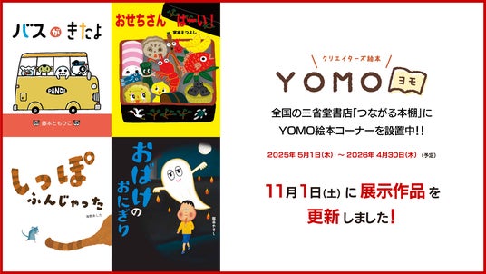 三省堂書店が展開する「つながる本棚」に、クリエイターズ絵本「YOMO」から選りすぐりの絵本や新刊絵本を設置しております。第4弾となる11月は、『バスがきたよ』『おせちさん はーい!』『おばけのおにぎり』『しっぽふんじゃった』の4作品をご紹介いたします。YOMO絵本大賞(絵本コンテスト)やイベント等の告知もいたしますので、お楽しみに!